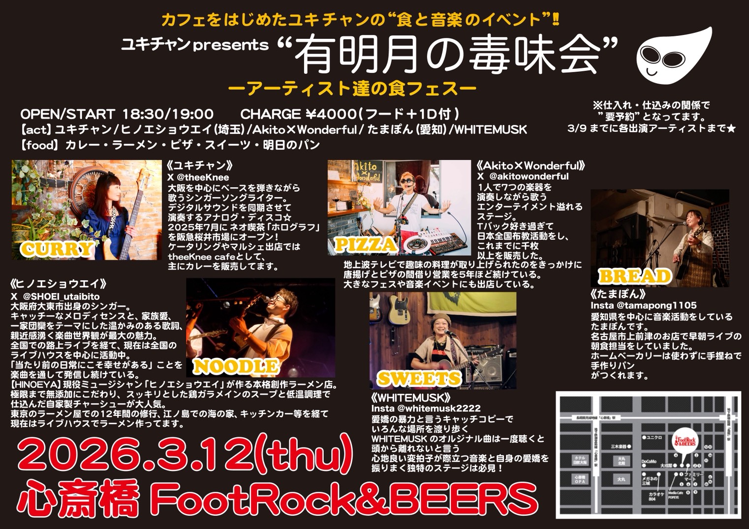 ユキチャン ヒノエショウエイ(埼玉) Akito×Wonderful たまぽん(愛知) WHITEMUSK 【food 】カレー・ラーメン・ピザ 【物販】スイーツ・明日のパン
