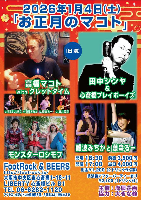★高橋マコトwithクレットタイム (G.貫井義正/B.西尾BUN博文/D.藤森るー/K.難波みちか) ★モンスターロシモフ ★田中シンヤ&心斎橋プレイボーイズ ★難波みちか と 藤森るー 主催:虎辰企画 協力:大きな輪